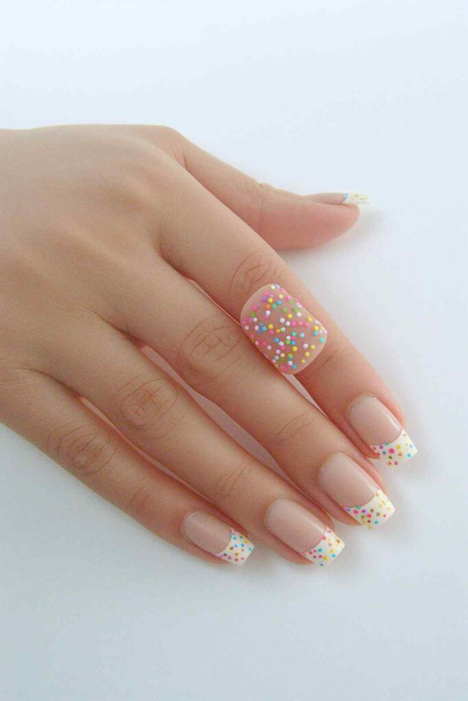 Paint your nails a neutral base and add colorful “sprinkles” with tiny dots in pastel or bright shades. It’s like wearing cupcakes on your nails!