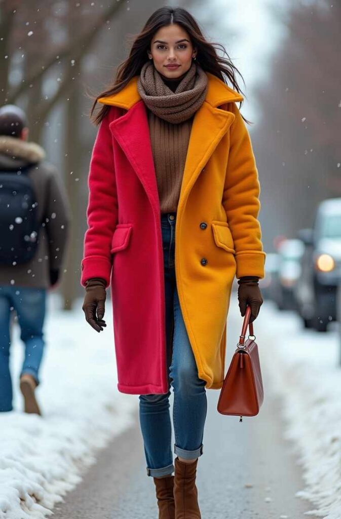Bright coats—reds, greens, blues, or pastels—instantly energize your winter outfits. A colorful coat becomes the focal point of your look, adding fun and vibrancy to the cold-weather palette. This style is perfect for those who love to stand out or brighten up dark winter days. The bold pop of color brings confidence and personality to any outfit.