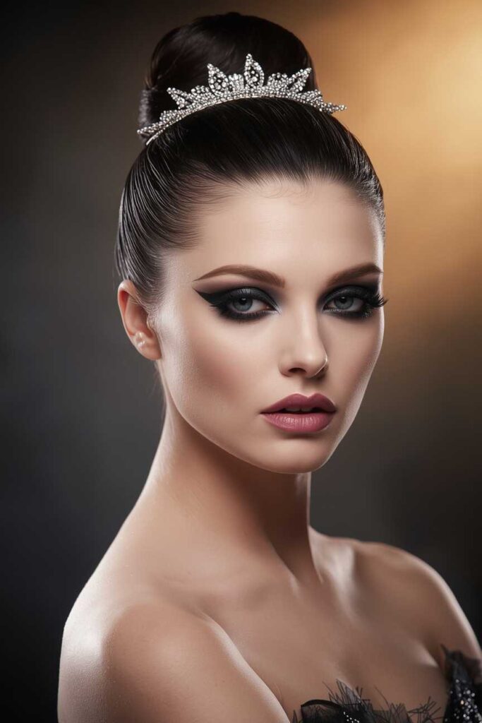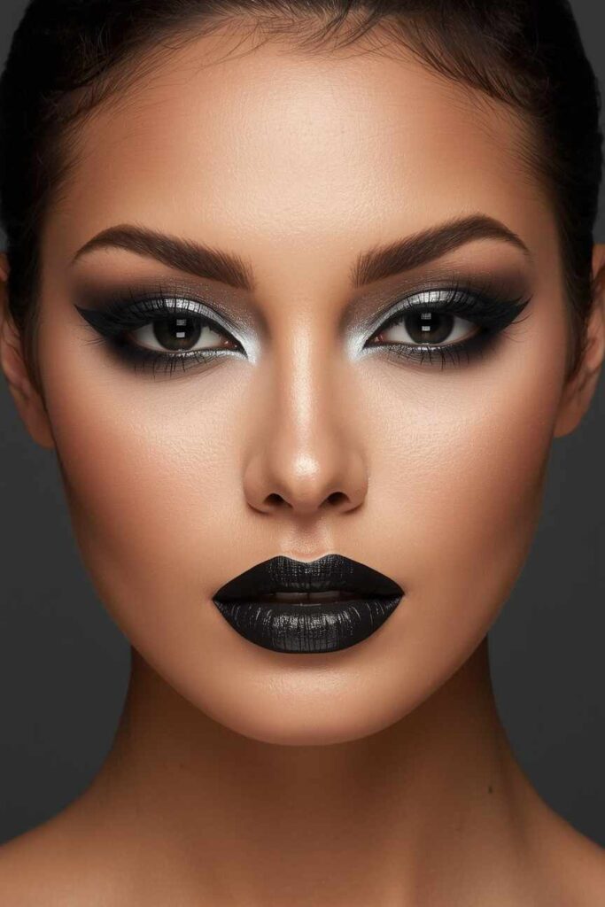 Inspired by the ballet’s haunting beauty, the Black Swan look combines elegance and darkness. Start with a flawless matte base, dramatic black winged eyes, and feather-like extensions drawn around the lids. Add ruby red lips for contrast. This look is perfect for those who want theatrical elegance — a little sinister, yet completely captivating, embodying both grace and madness in one hauntingly beautiful creation.