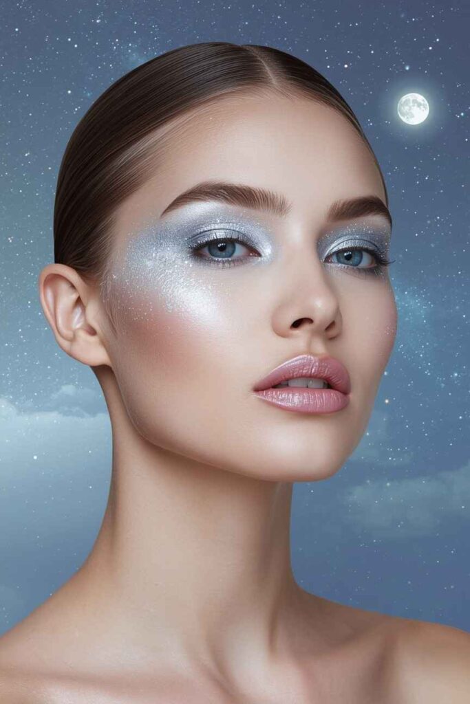 Create a heavenly, cosmic look with silver tones and shimmering highlights. Apply luminous foundation, then accentuate your eyes with metallic silver eyeshadow and pearl accents near the corners. Add a touch of glitter to your temples for an ethereal finish. This celestial-inspired makeup is ideal for moon goddess or space-queen costumes — elegant yet dreamily magical, offering a divine touch that makes you sparkle under any light.