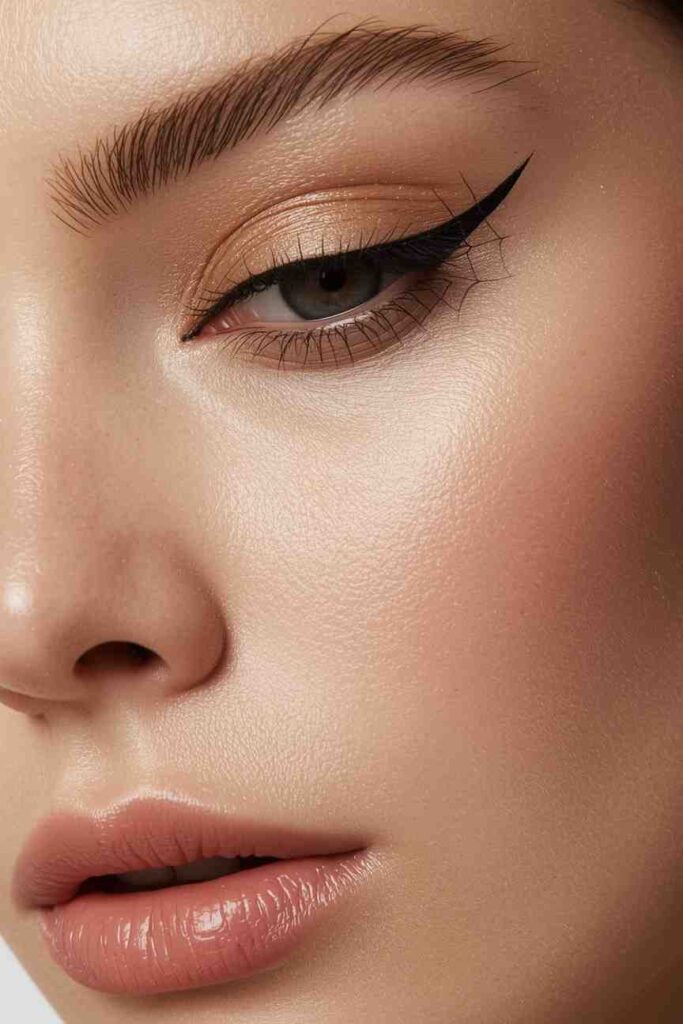 For something simple yet statement-making, draw delicate spider webs at the corners of your eyes using eyeliner. Add a shimmer base and long lashes for contrast. Keep lips nude or lightly tinted. This minimalist Halloween detail adds an elegant edge to your makeup — spooky enough for the theme, but still polished and runway-ready.