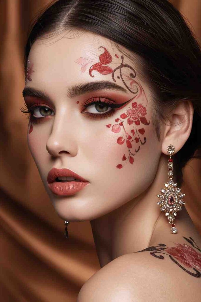 Combine romance and darkness with rose-inspired makeup. Use burgundy and black eyeshadows, blending them into soft petal shapes around your lids. Add deep red lipstick and a dusting of highlight for a subtle glow. This look captures gothic romance perfectly — mysterious, emotional, and utterly glamorous for Halloween evening events.