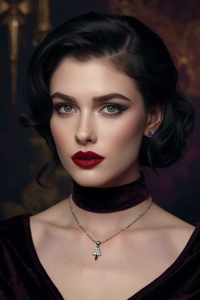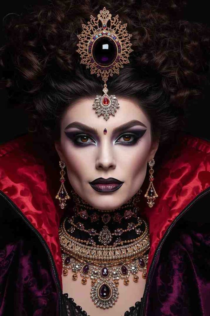 Skip the fake blood and go for a luxurious vampire aesthetic. Focus on flawless skin, contour your cheekbones sharply, and pair it with bold red or wine lips. Add deep smokey eyes with hints of shimmer to create a mesmerizing stare. A touch of highlight on your collarbones completes the immortal glow. This look says “eternal beauty” — sophisticated, sultry, and hauntingly chic without crossing into horror territory.
