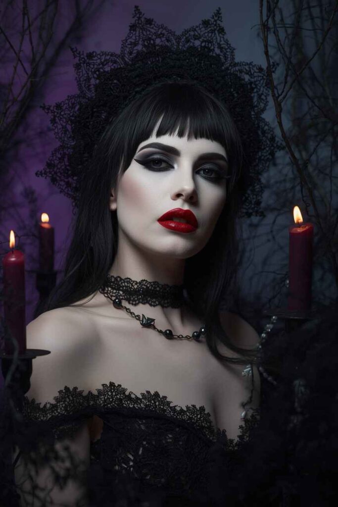 Channel your inner gothic goddess with a look that’s both dark and graceful. Start with a porcelain base, defined brows, and deep burgundy lips. Add subtle black eyeshadow blended with plum for a smoky finish. Highlight the high points of your face to contrast the dark tones. This gothic glam look captures mystery and power, perfect for a candlelit Halloween party. Finish with a sleek updo or soft curls for timeless elegance.
