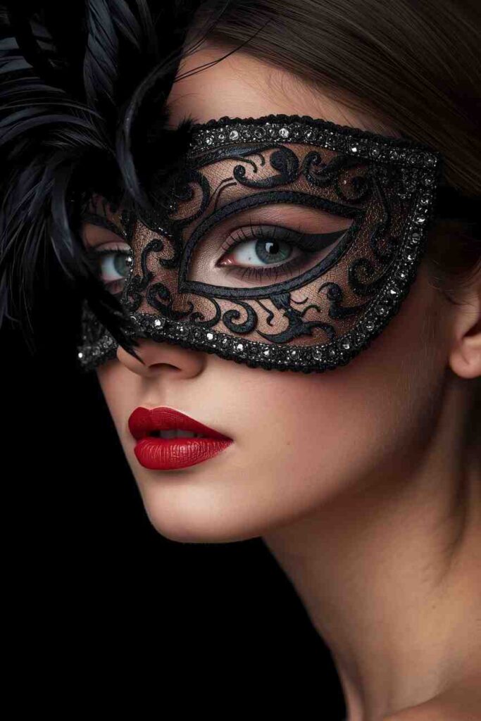 If you love mystery, go for a half-face masquerade design. Outline one side of your face with intricate black lace patterns or gold filigree drawn with eyeliner. Add metallic eyeshadow and voluminous lashes for a glamorous finish. The look is both enchanting and mysterious — perfect for high-end Halloween events where style and intrigue meet. Pair with an elegant gown or sleek jumpsuit to complete the vibe.