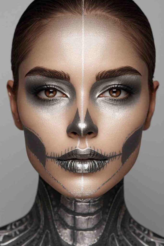 For a classy take on skull makeup, opt for metallic silver instead of white. Paint skeletal outlines delicately along your cheekbones and jawline using silver and black paints. Keep your eyes sultry with smokey eyeshadow. The contrast of metallic and matte creates a chic, fashion-forward twist on a classic Halloween icon — edgy yet sophisticated, perfect for stylish parties.