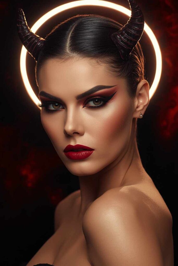 Swap scary horns for smoldering beauty. Think fiery red lips, bold brows, and eyeshadow in shades of crimson and black. Add a touch of gold shimmer to the inner corners of your eyes for extra allure. The result? A devilishly divine makeup look that oozes confidence and sophistication — perfect for a night where you rule the dance floor.