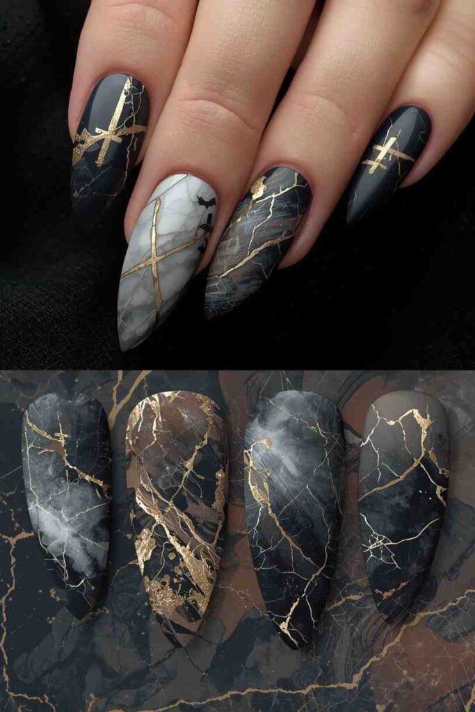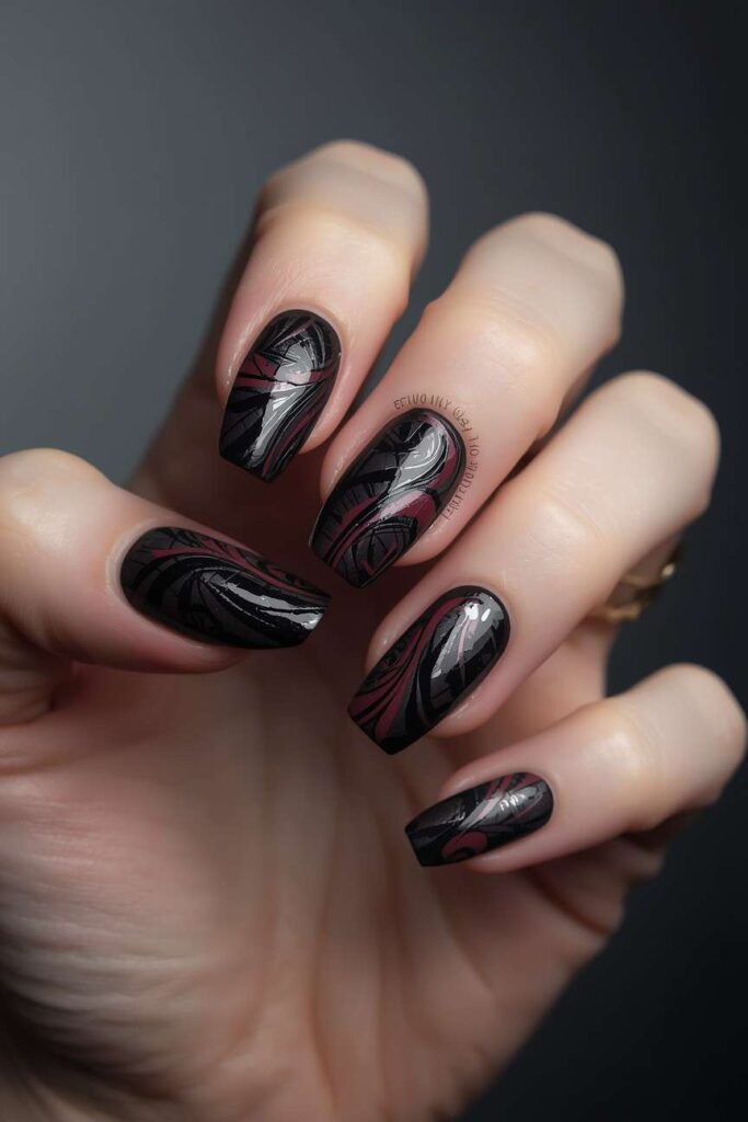Black and gray marble nails create dramatic visual depth. Add streaks of silver or dark red to mimic gothic textures. This manicure offers an artistic, moody aesthetic, perfect for fall nights. The marble effect pairs well with both matte and glossy finishes, depending on your preferred vibe.