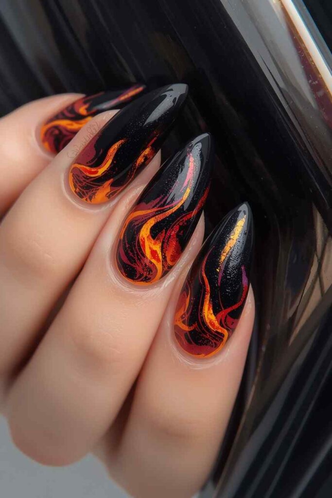 Flame art on nails gives a bold, fiery goth glam look. Use black flames over a neutral or burgundy base for contrast. This dramatic design works well for edgy fashion statements, offering a rebellious fall aesthetic.