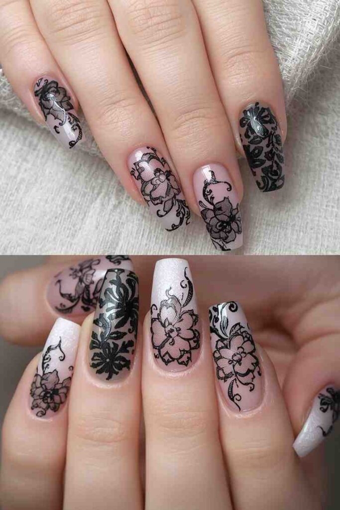 Delicate lace patterns over a neutral base give nails a gothic yet feminine charm. Using fine black detailing on taupe or beige nails, the lace design looks intricate and stylish. Add small rhinestones for subtle sparkle. This design balances gothic aesthetics with soft elegance, making it versatile for fall events or nights out.