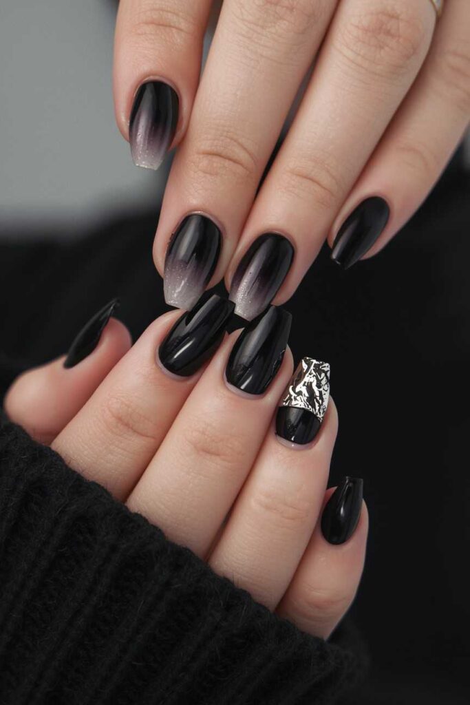 Ombre nails blending black and nude tones give a seamless, edgy finish. The dark-to-light gradient captures fall’s moody atmosphere while maintaining balance. Add a small silver foil accent for texture. This style is ideal for those who want gothic vibes with a softer twist, offering elegance and drama in one manicure.