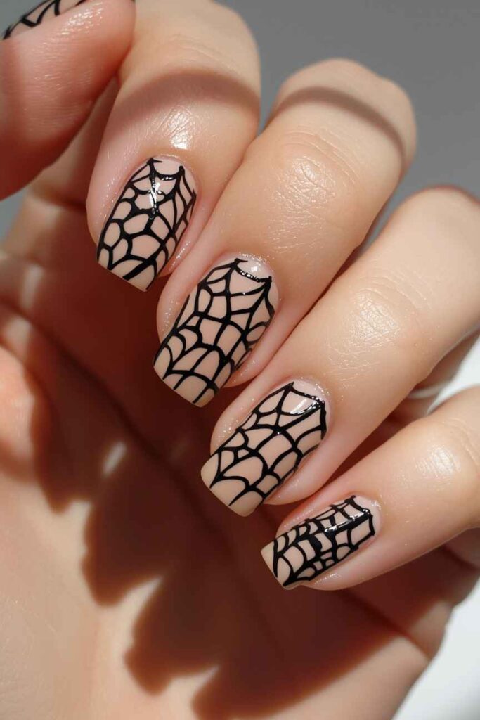 Spider web detailing on nude or gray bases creates spooky-chic fall nails. This goth glam design is playful yet edgy, ideal for seasonal occasions like Halloween or autumn events. Keep the webs fine and detailed for a stylish finish.