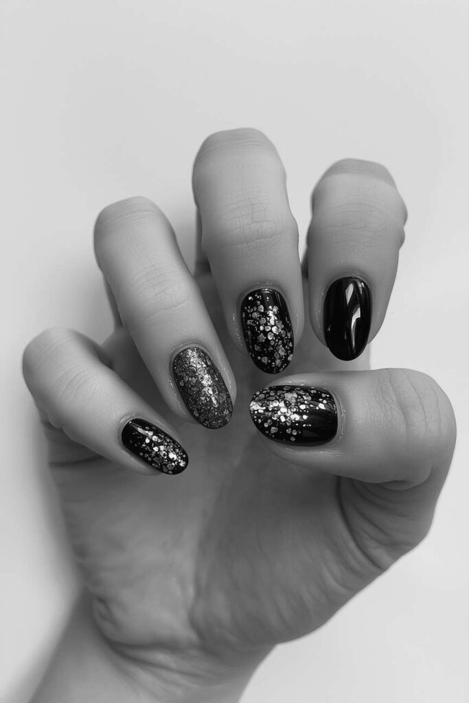 Mixing black nails with silver glitter accents creates a striking goth glam look. Keep most nails matte black and highlight one or two with shimmering silver. This design works beautifully for parties or festive gatherings while maintaining a moody autumn aesthetic.