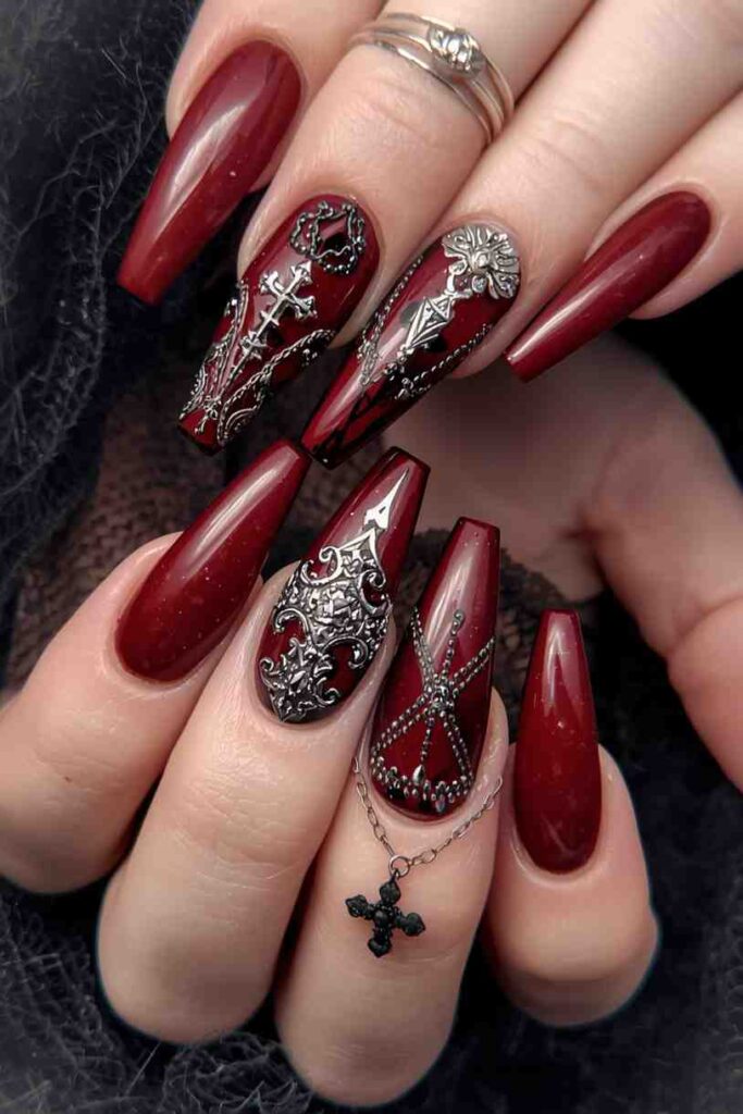 Deep burgundy nails channel gothic romance. Glossy finishes bring richness, while matte adds moody sophistication. Accentuate with tiny black dots or metallic studs for a dramatic effect. This style is perfect for both formal occasions and casual evenings, offering a fall-appropriate look that merges elegance with boldness.