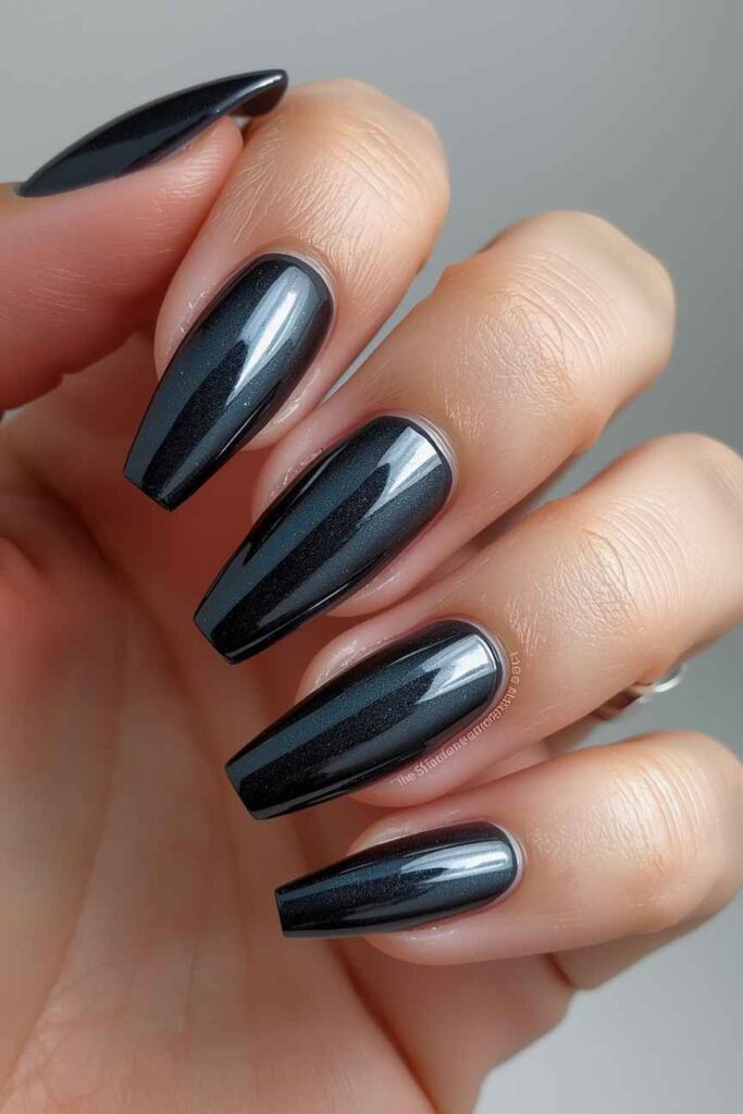 Black chrome nails with reflective finishes add futuristic edge. Shades of gunmetal, steel, or deep bronze create a moody, goth glam vibe. Pair with matte accent nails for contrast. This bold style works perfectly for those who want statement nails that stand out all season long.