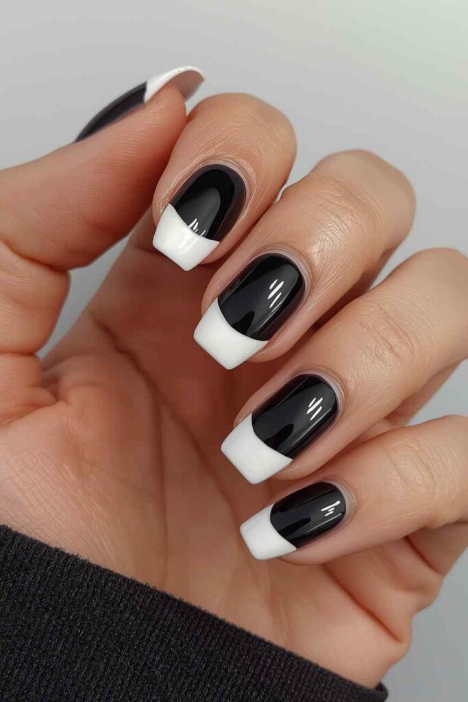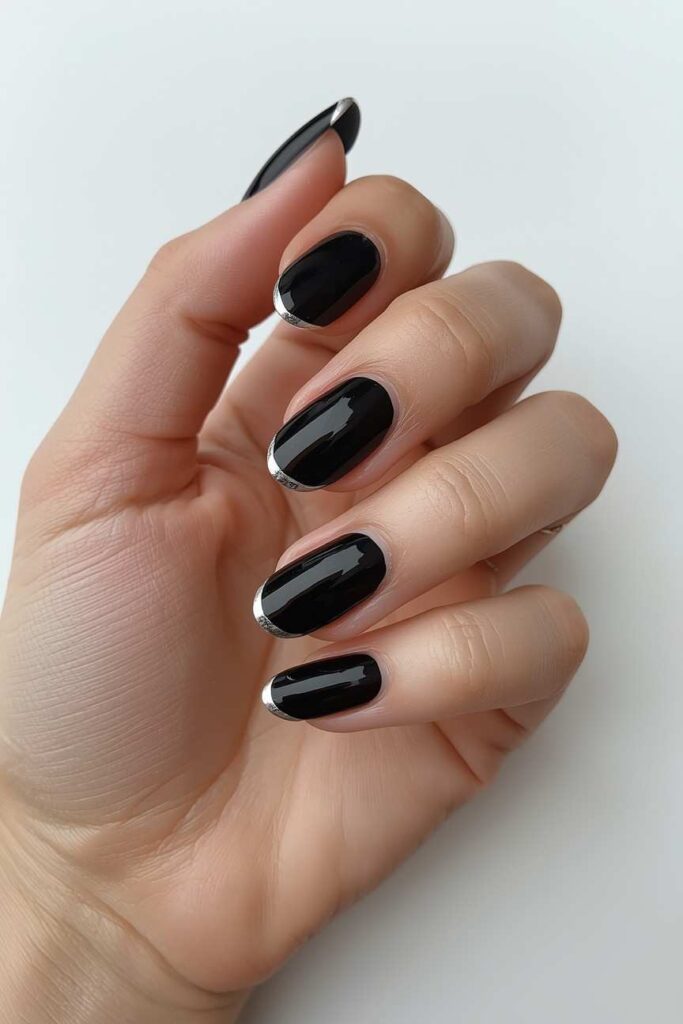 Black French tips bring a goth glam edge to the classic design. Pairing a nude or taupe base with glossy black tips creates bold contrast while remaining wearable. Add metallic dots or fine line accents for extra detail. This manicure suits both short and long nails, making it versatile for everyday wear or special events. Perfect for those who want a minimalist base with a gothic upgrade.