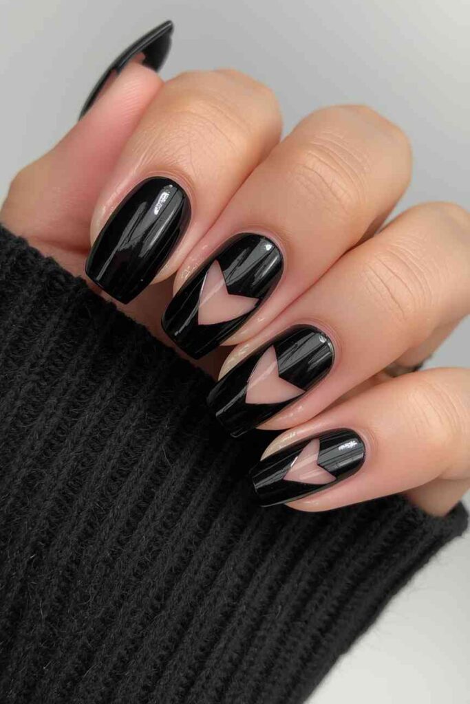 Glossy black nails with nude negative-space cut-outs balance boldness and minimalism. Shapes like triangles or stripes add modern flair while keeping the design edgy. This manicure captures goth glam with a contemporary twist, wearable all season long.