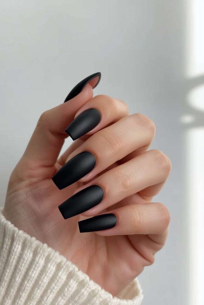Matte black nails are effortlessly edgy. Their velvety texture creates a moody, modern look that feels bold without extra detailing. Add silver or red accents on one or two nails for variety. This manicure works best for fall evenings, offering an elegant yet rebellious vibe. Pair with leather jackets or chunky rings to highlight the gothic flair.