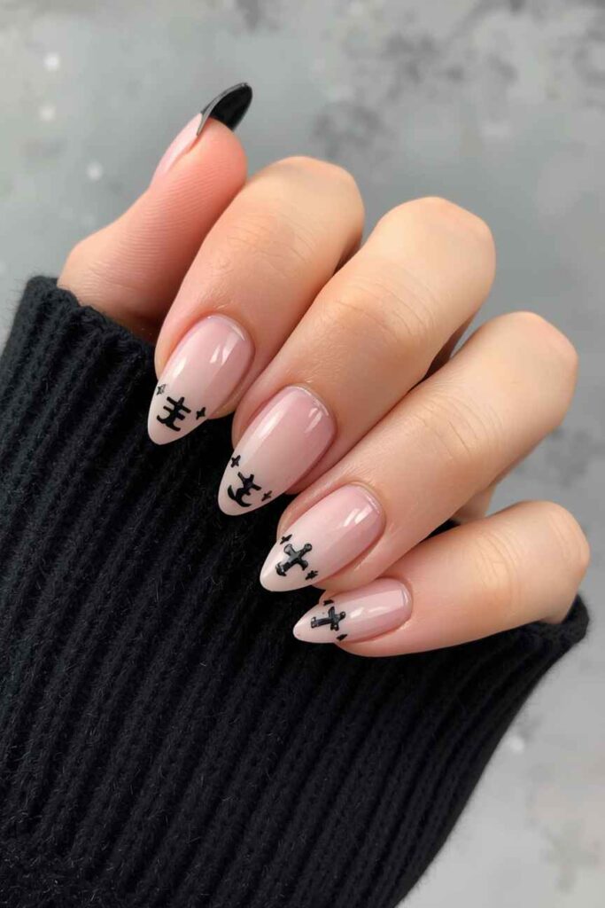 Start with a sheer nude base and add small gothic symbols like crosses, moons, or stars in black. This design offers subtle goth glam while remaining understated. Perfect for those who want neutral nails with a symbolic, edgy touch.