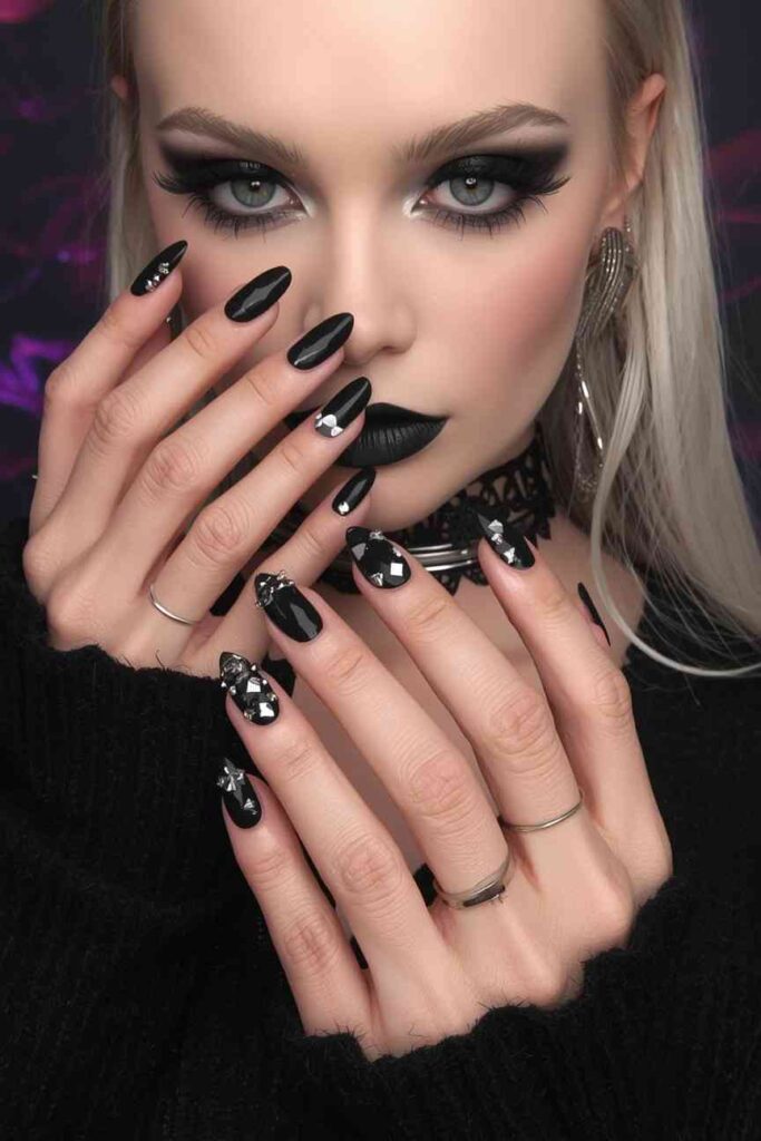 Choosing the right goth glam manicure depends on your comfort level and style. If you want bold drama, go for full black, chrome, or marble designs. For a subtler approach, choose neutral bases with black accents or gothic symbols. Colors like burgundy, forest green, and deep taupe add seasonal depth, while finishes—matte, glossy, or metallic—define the mood. Accent nails with glitter or foil can elevate simpler styles. Balance your choice with your wardrobe and occasions, ensuring your nails feel both wearable and expressive.