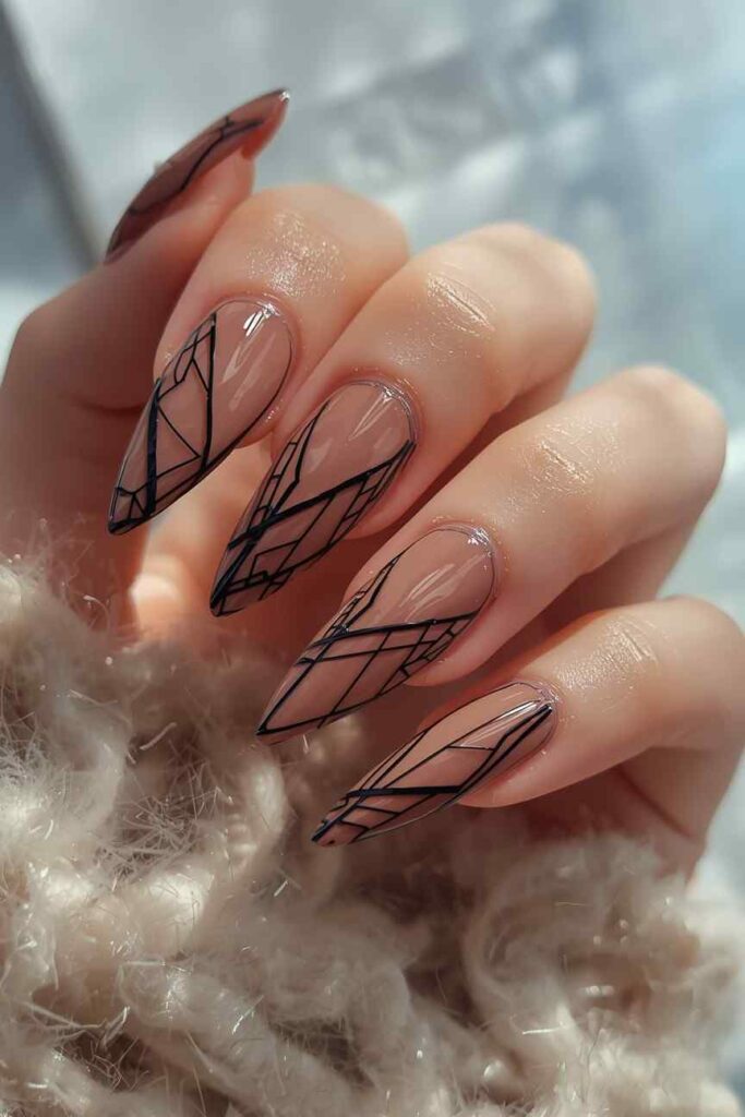 Abstract black lines on nude or gray bases create modern gothic art. Use sharp, angular strokes for an edgy effect. This design feels minimalist yet expressive, ideal for fashion-forward individuals who enjoy unique manicures with a gothic edge.