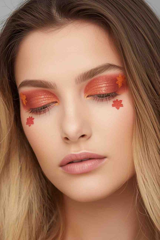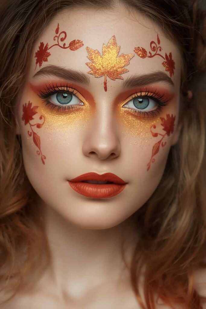 Paint tiny maple leaves around your eyes using warm reds and oranges. Blend these shades into your eyeshadow for a cohesive, autumn-inspired look. Add a touch of glitter to mimic sunlight on leaves. This creative makeup idea embodies fall beauty while keeping a subtle Halloween flair.