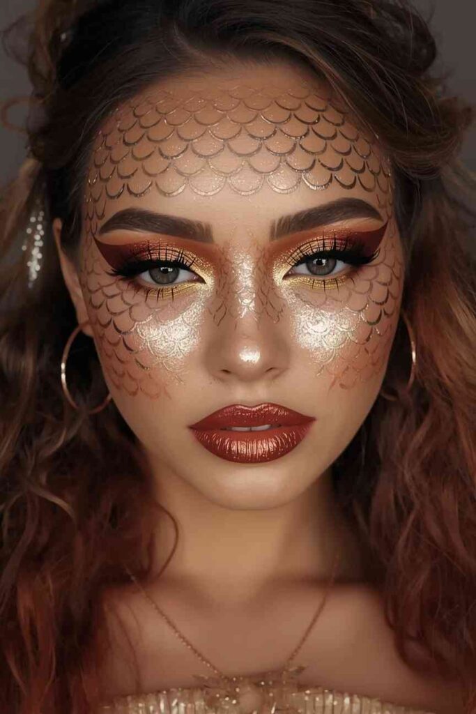 Give mermaid makeup an autumnal twist using copper, bronze, and gold scales. Use mesh or stencils to create scale patterns across your cheeks or temples. Add gold shimmer around the eyes and finish with glossy lips. This makeup blends fantasy with fall — perfect for creative souls who love something unique.