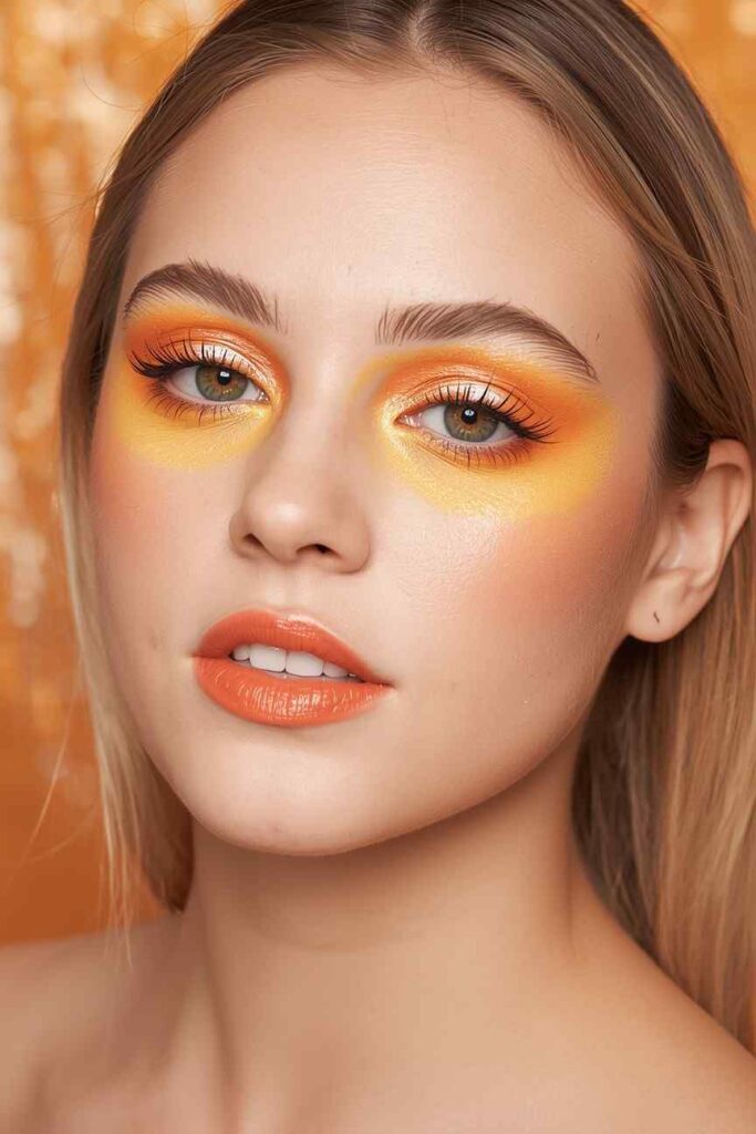 Inspired by the Halloween classic treat, this look features cheerful orange, yellow, and white hues. Blend these colors into a gradient on your eyelids and add a pop of glitter for sweetness. Pair with peachy blush and a light coral lip to balance the brightness. It’s playful, vibrant, and irresistibly festive — ideal for teens or anyone craving a colorful Halloween vibe.