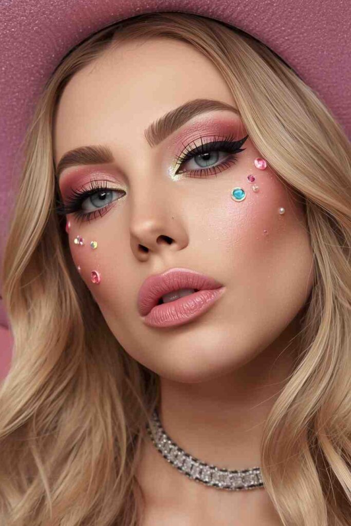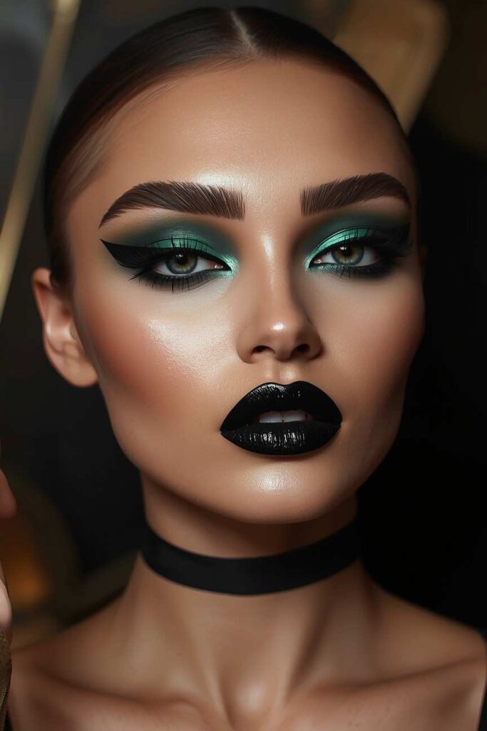 Blend sweetness and spookiness with pastel pinks, purples, and greens. Add candy-shaped gems or glitter to your cheeks and eyelids. Pair with bold eyeliner and bubblegum-pink lips. This look gives witch energy but with a sugar-coated twist — ideal for anyone who wants something fun, flirty, and Instagram-worthy.
