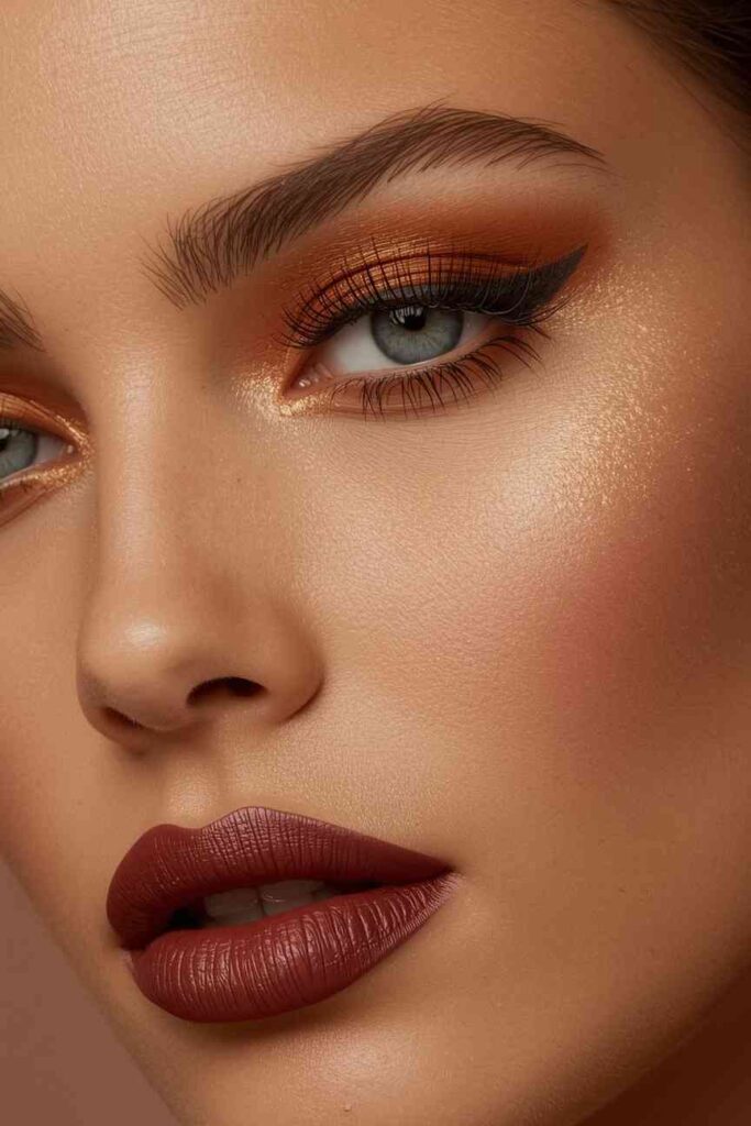 For a sultry autumn vibe, go for warm cinnamon and brown smoky eyes. Blend dark brown into the outer corners and highlight with copper shimmer. Finish with nude lips and bronzer for a soft yet bold appearance. This versatile look transitions perfectly from a cozy fall dinner to a Halloween bash.