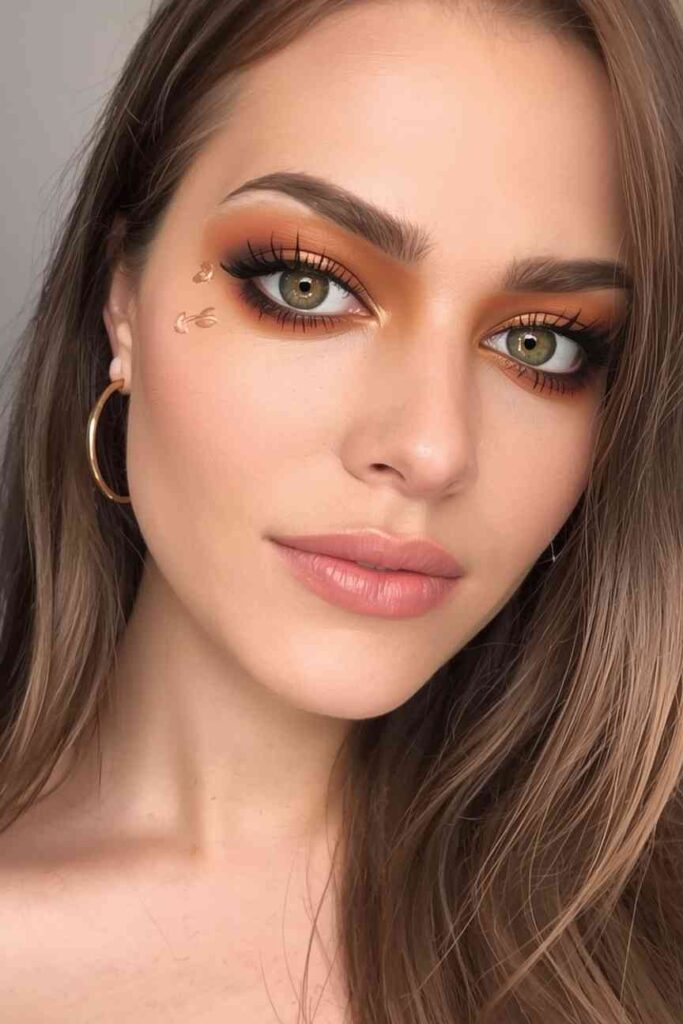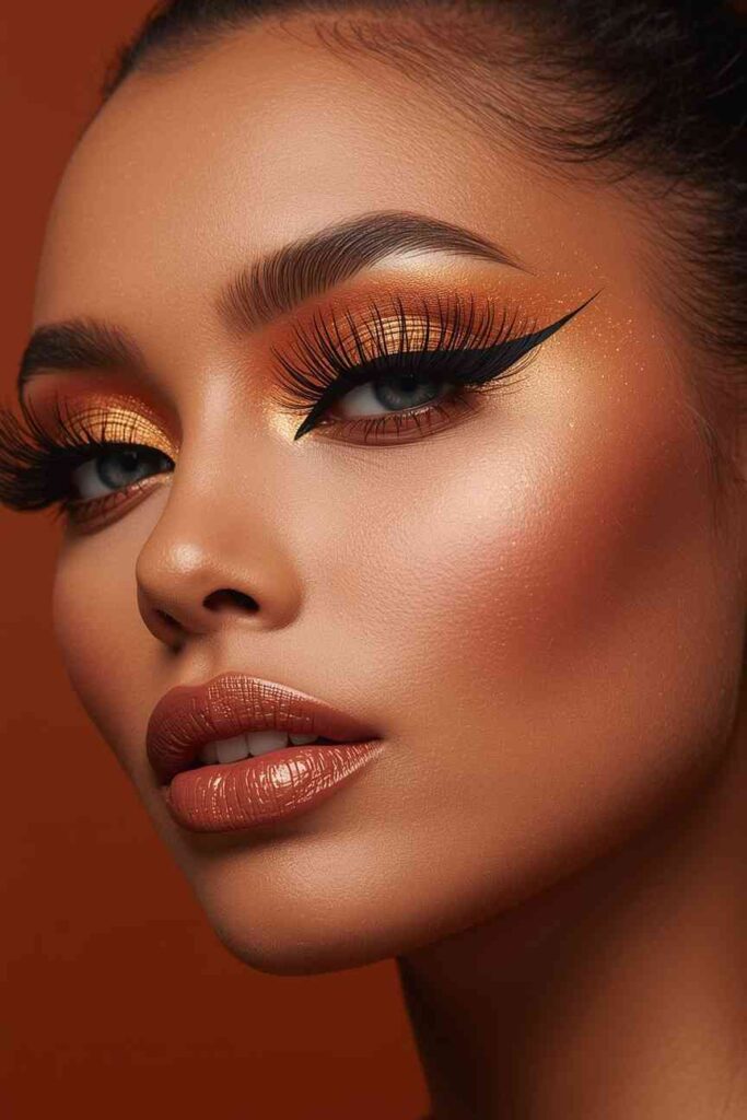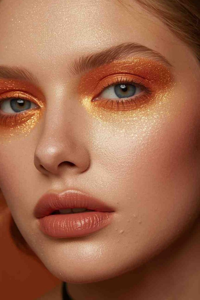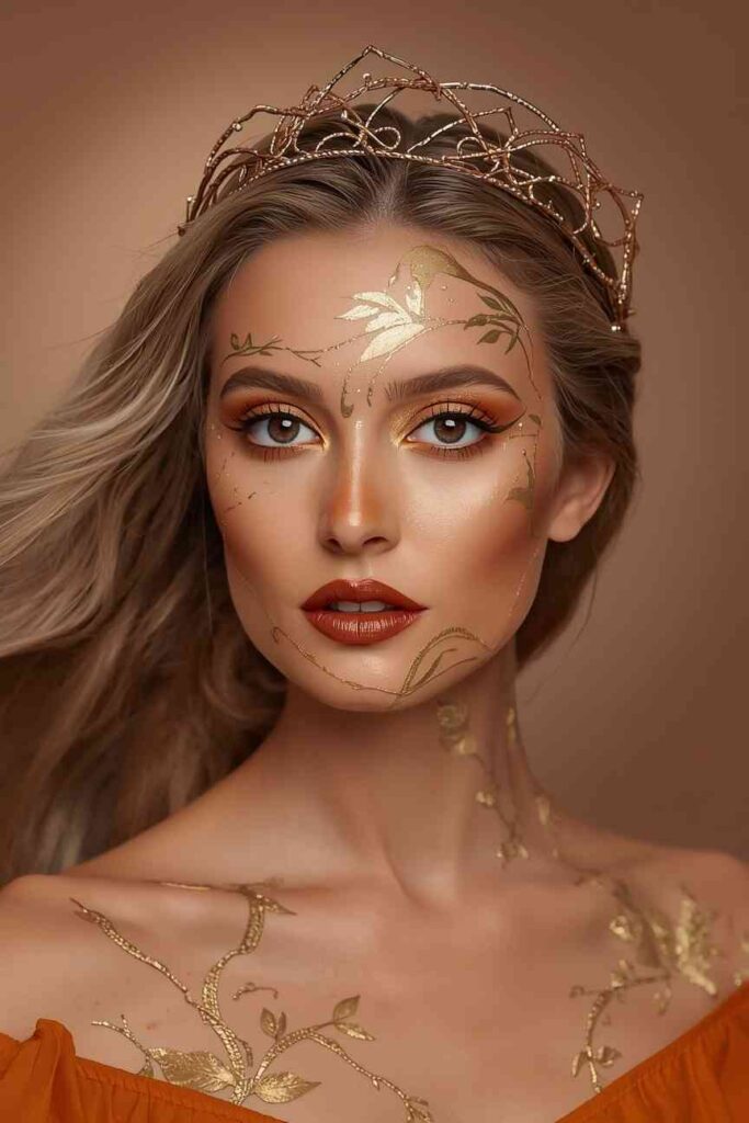 Go full-on glam with a metallic orange and gold smoky eye, paired with fluttery lashes and glossy lips. Add golden freckles or pumpkin outlines near your temples for a regal touch. This look is dramatic, elegant, and perfect for those who want to be the center of attention this Halloween.