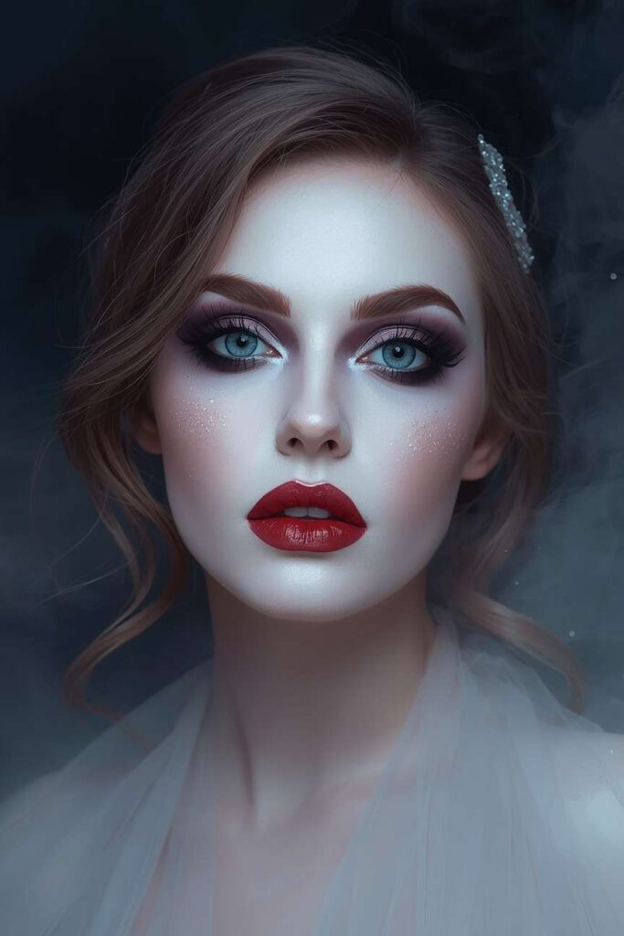 Ditch the pale white paint and go for a glowy ghostly look. Use silvery highlighter, cool-toned eyeshadow, and a light nude lip for a hauntingly beautiful appearance. Add iridescent shimmer under the eyes for an ethereal touch. This design is soft, elegant, and perfect for adults who want to look otherworldly yet refined.