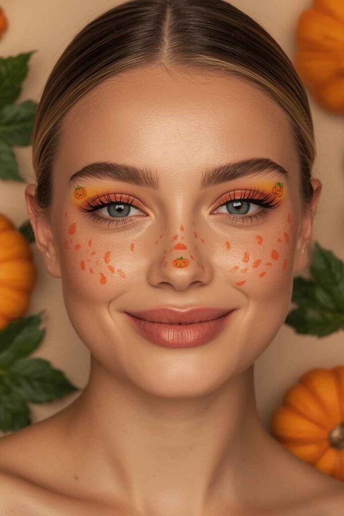 Create adorable pumpkin freckles across your nose and cheeks using orange eyeliner or face paint. Pair this with warm-toned eyeshadow and a peachy gloss. Add a bit of gold highlighter to your cheekbones to enhance your glow. This cute, seasonal makeup is perfect for teens or anyone who loves playful, cozy Halloween aesthetics.