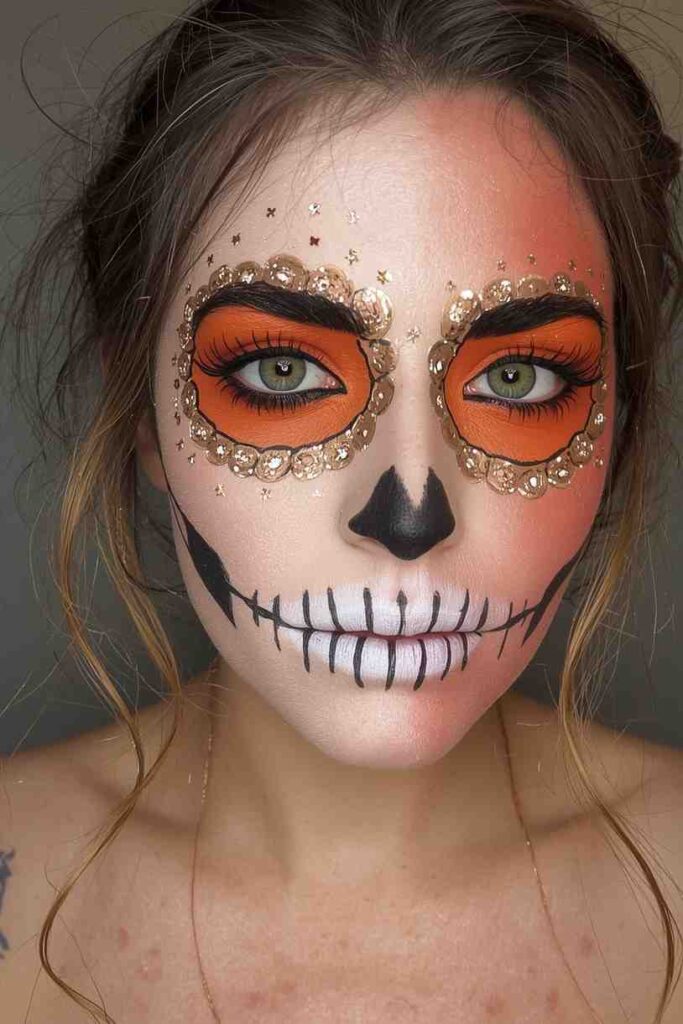 Combine creepy and cute by painting orange and black skull patterns on half of your face. Use gold or glitter accents to keep the look artistic rather than gory. This design perfectly balances festive fun with spooky flair — great for those who love statement makeup with creative detail.