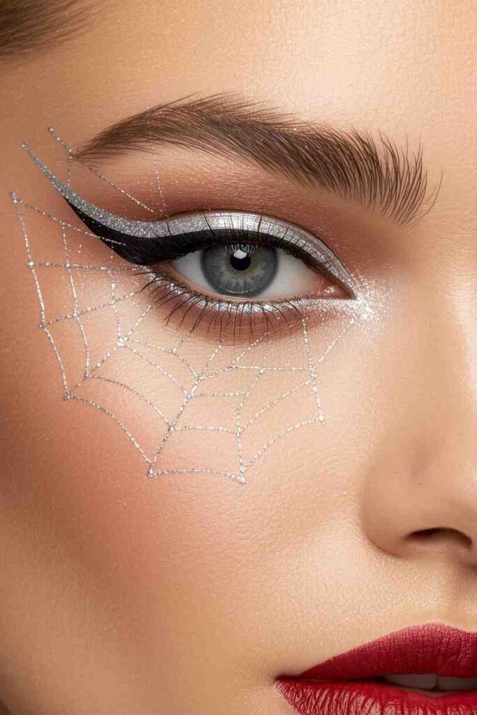 Draw delicate spider webs extending from the corners of your eyes using silver or black eyeliner. Add rhinestones where the lines meet for a glam touch. Pair with dark eyeshadow and plum lipstick for a mysterious finish. This spooky yet chic look blends elegance with Halloween fun — perfect for costume parties and photoshoots.