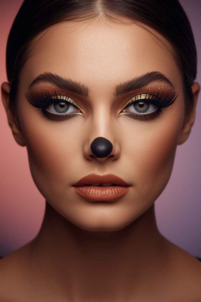 Upgrade the classic cat look with dramatic eyes and a glowing twist. Blend dark brown and gold eyeshadows for depth, then draw whiskers and a small nose. Use black eyeliner to elongate your eyes for a fierce feline finish. Add a glossy lip and highlighter for extra shine. This versatile look is simple, elegant, and undeniably Halloween-ready.