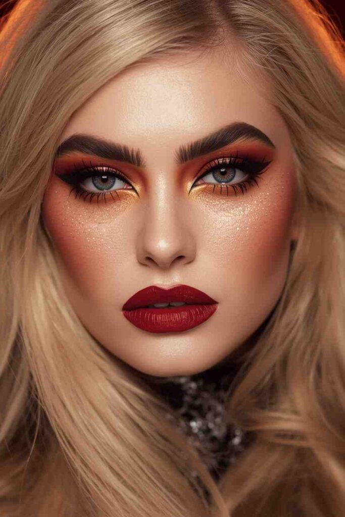 Combine the allure of a vampire with the warmth of pumpkin spice. Use deep red and orange shadows for a fiery gradient effect. Pair with a bold red lip and subtle black contouring for a hauntingly glamorous finish. This look is perfect for anyone who wants elegance with a bite — equal parts spooky and stunning.