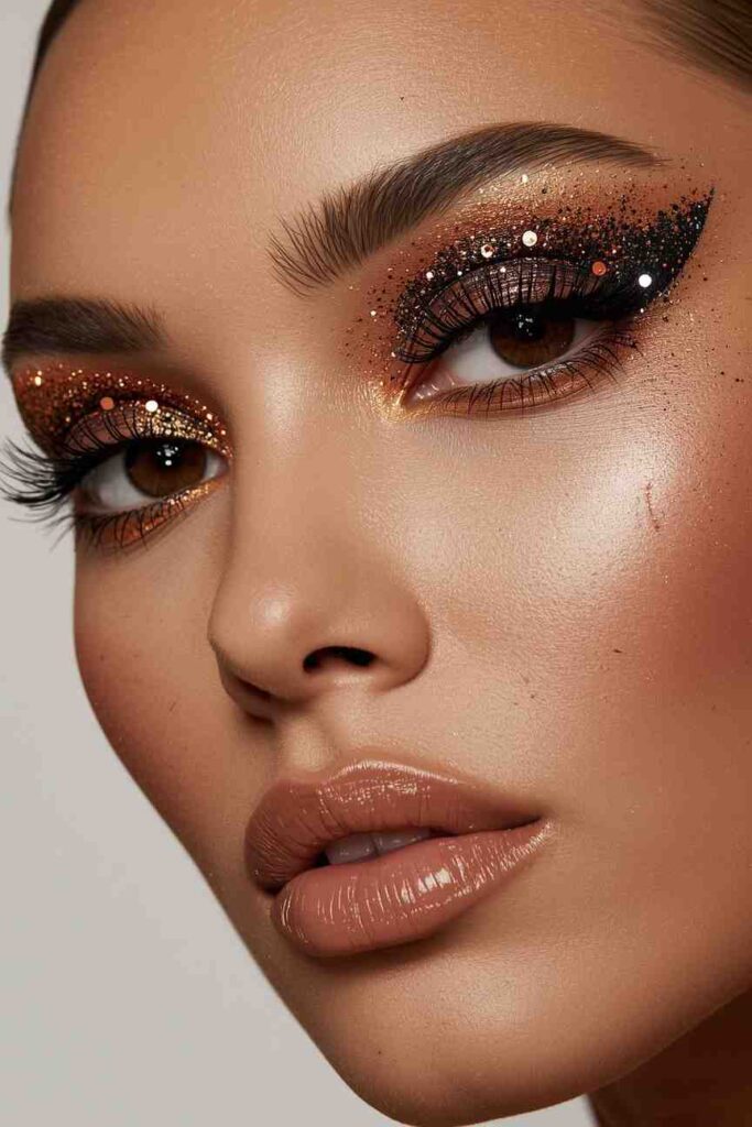 Focus all the drama on your eyes with chunky orange, black, and gold glitter. Use black eyeliner for definition and pair with a soft nude lip. The look sparkles beautifully under lights and photographs stunningly. Perfect for Halloween events, this design mixes festive and fierce energy effortlessly.