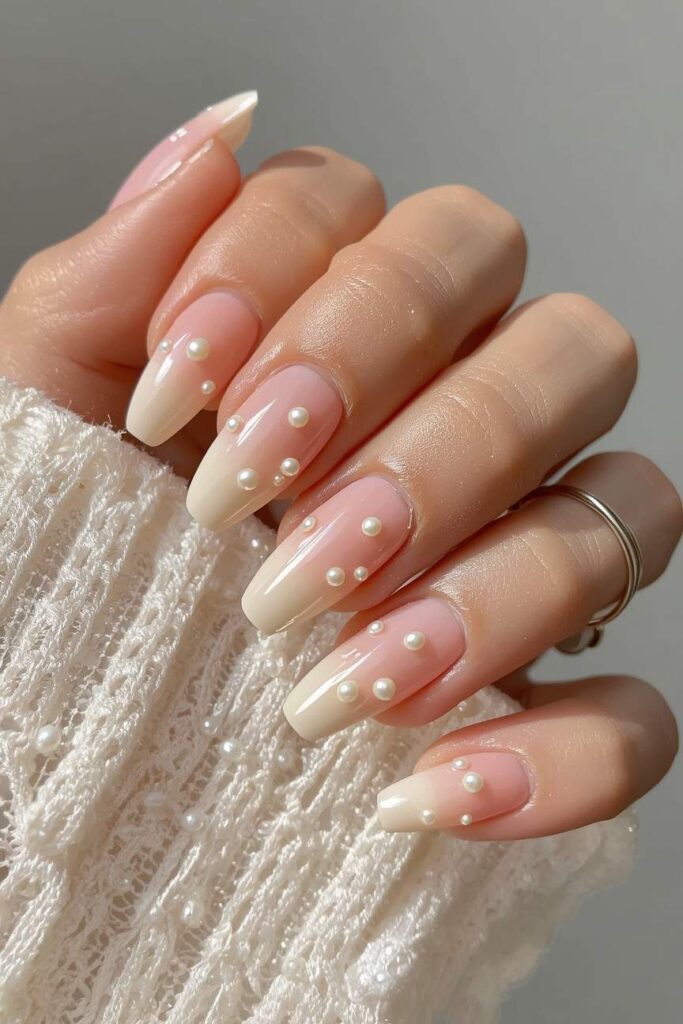 Adding tiny pearls to light pink nails creates a vintage, sophisticated look. This design pairs beautifully with lace or classic gowns.