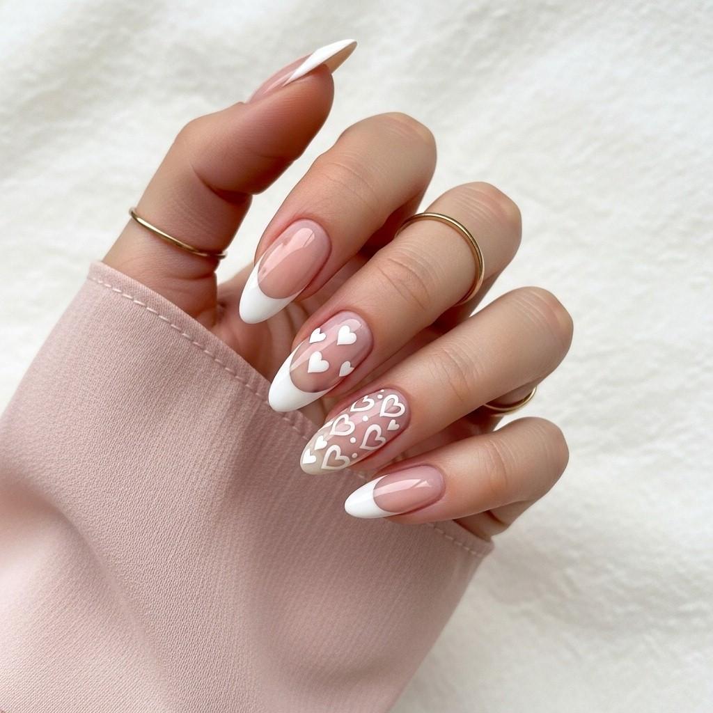 A nude pink base with delicate white designs such as flowers or French tips creates a soft, elegant, and feminine bridal look.