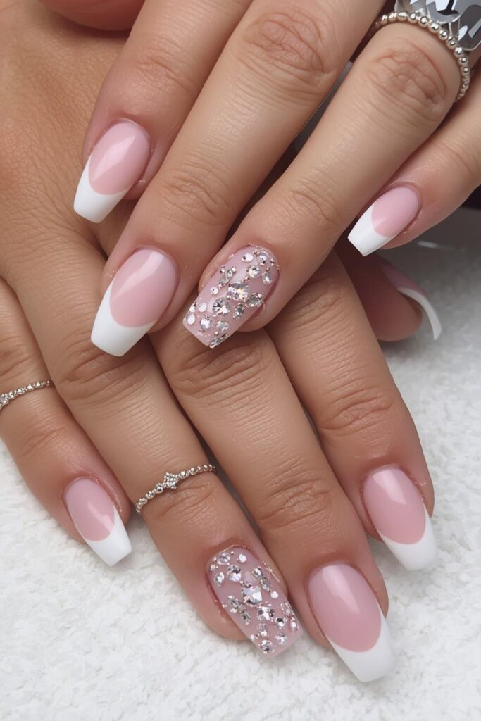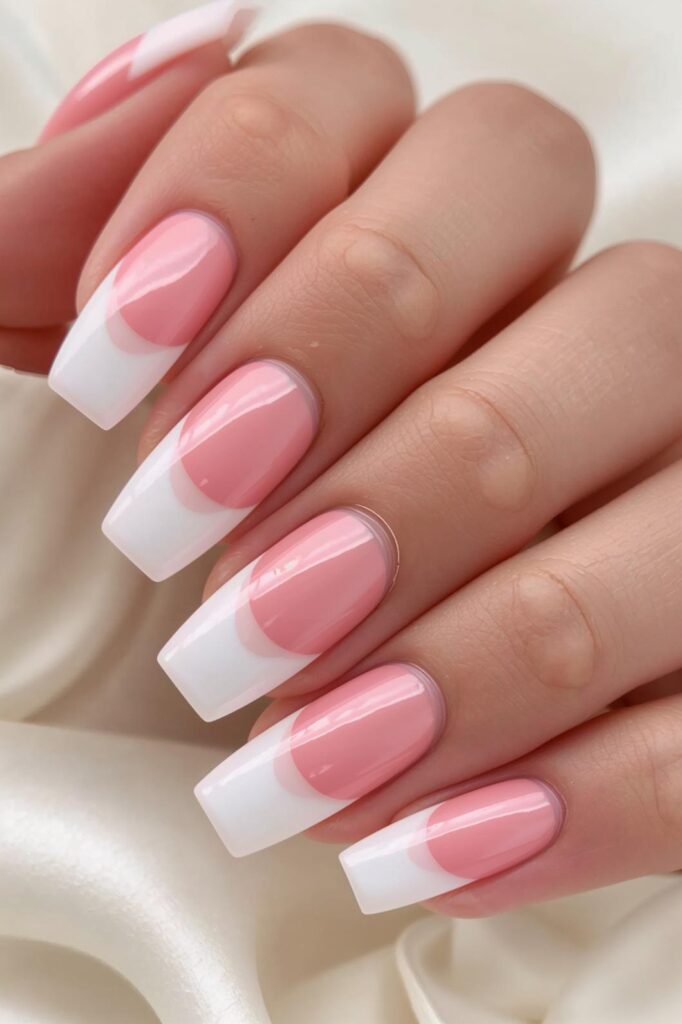 A classic French manicure with pink tips adds a modern twist. This design is simple yet sophisticated, perfect for understated elegance.