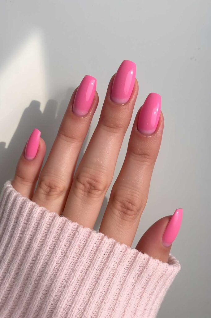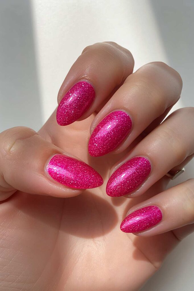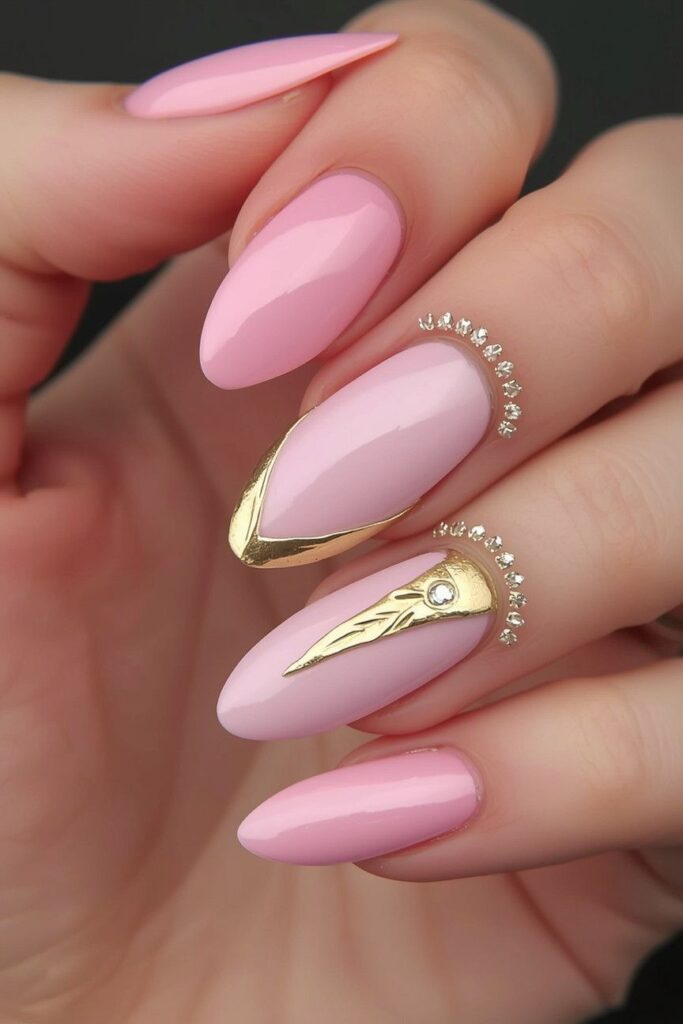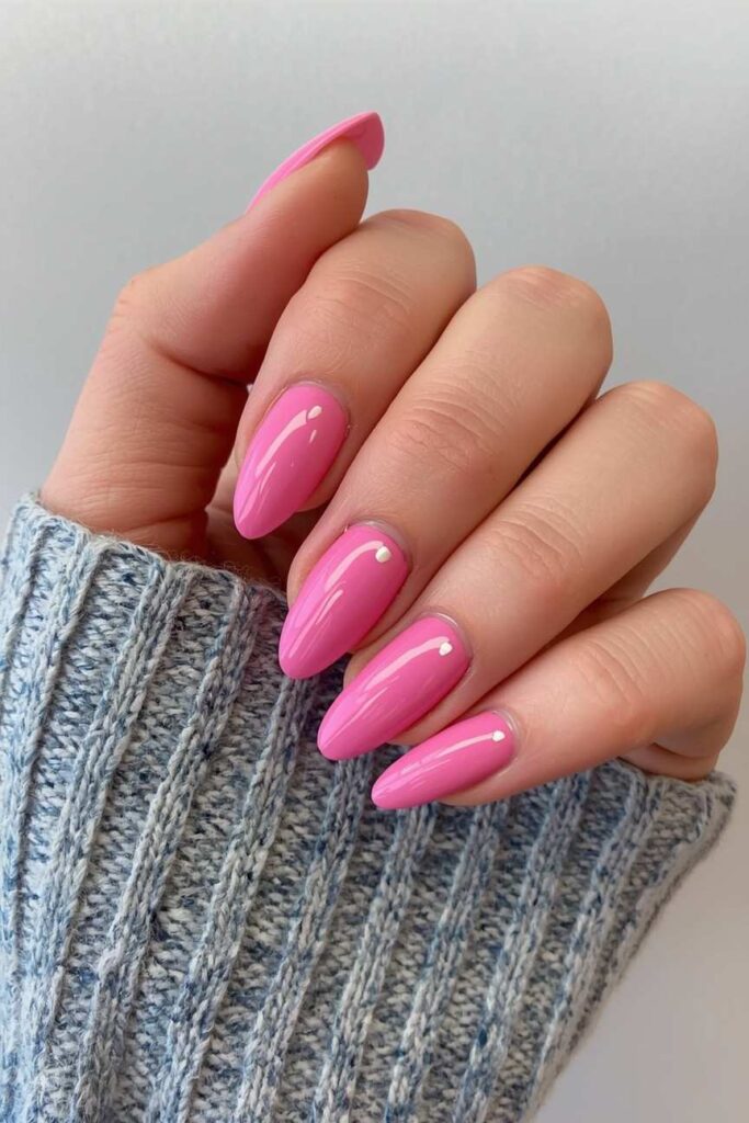 Almond-shaped pink nails elongate fingers and look graceful. They are flattering for all hand shapes and add a soft, feminine charm.