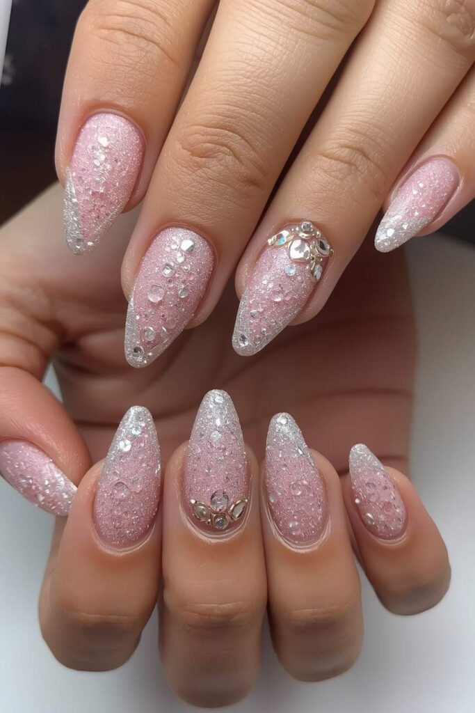 A gradient glitter effect over pink nails adds subtle sparkle and elegance. This design is perfect for brides seeking a romantic, eye-catching manicure.