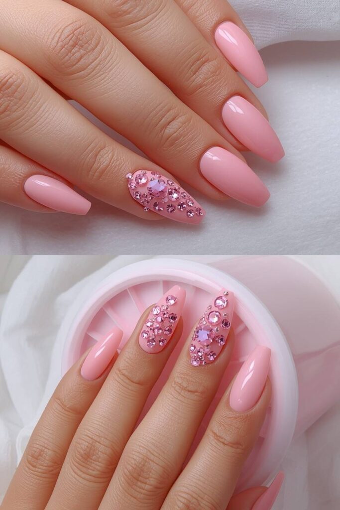 Incorporating rhinestones into pink nails adds sparkle and luxury. Place them on one or two accent nails for a balanced, glamorous effect.