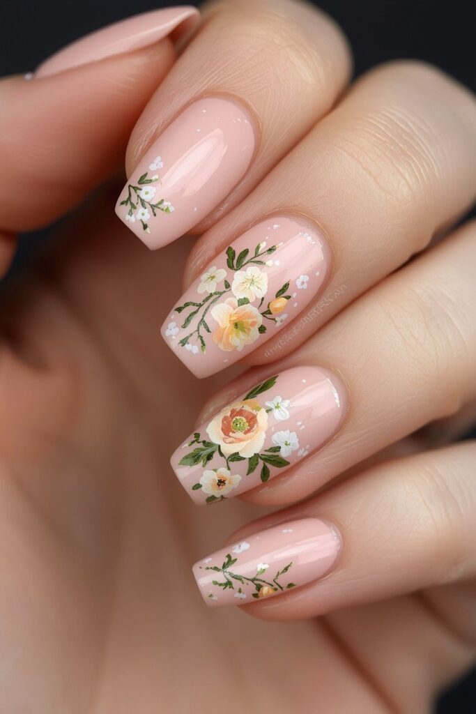 Hand-painted flowers on pink nails create a whimsical and romantic look. Ideal for garden weddings or spring bridal themes.
