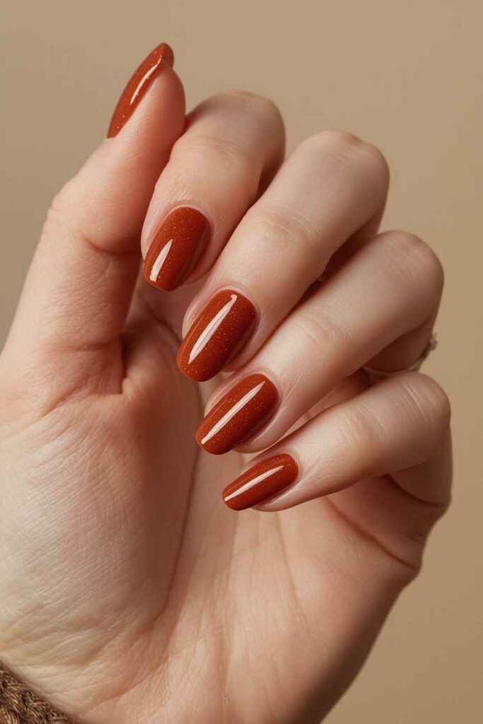 Burnt sienna nails capture the rustic tones of autumn leaves. This warm, earthy shade provides a chic base for accent nails, glitter tips, or subtle patterns, making it perfect for cozy fall aesthetics.
