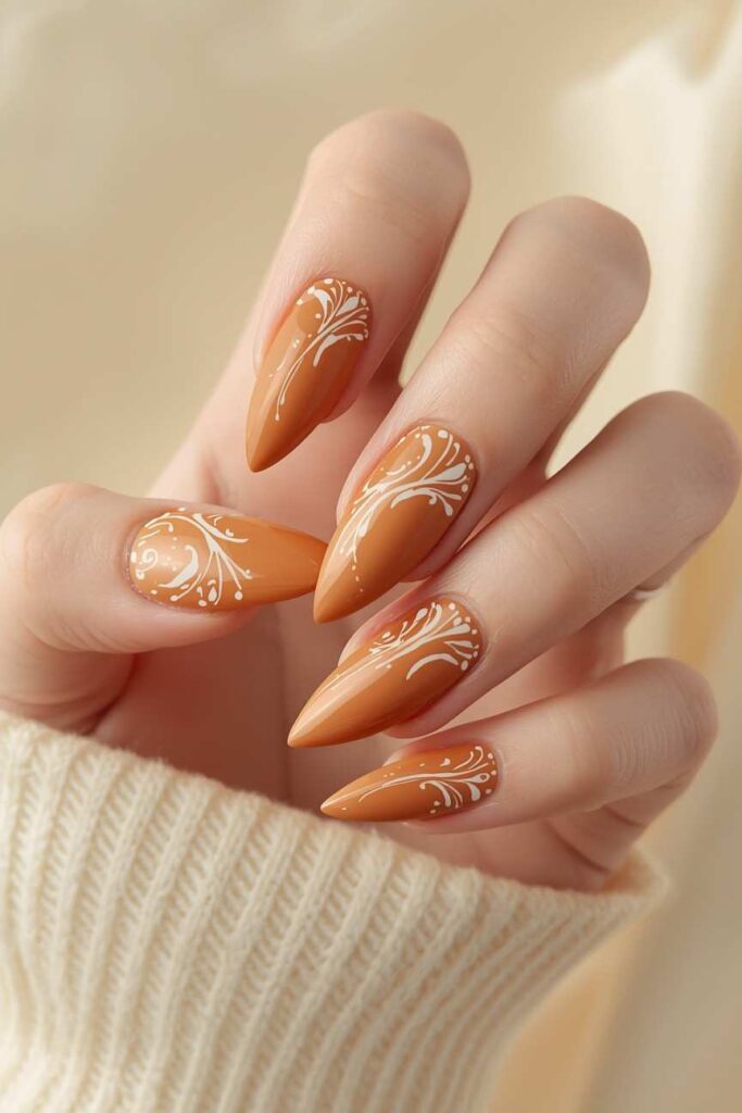 Cinnamon-inspired nails feature warm brown-orange tones reminiscent of fall spices. This cozy shade pairs beautifully with matte finishes or subtle glitter accents, giving your manicure a festive and stylish vibe for the season.