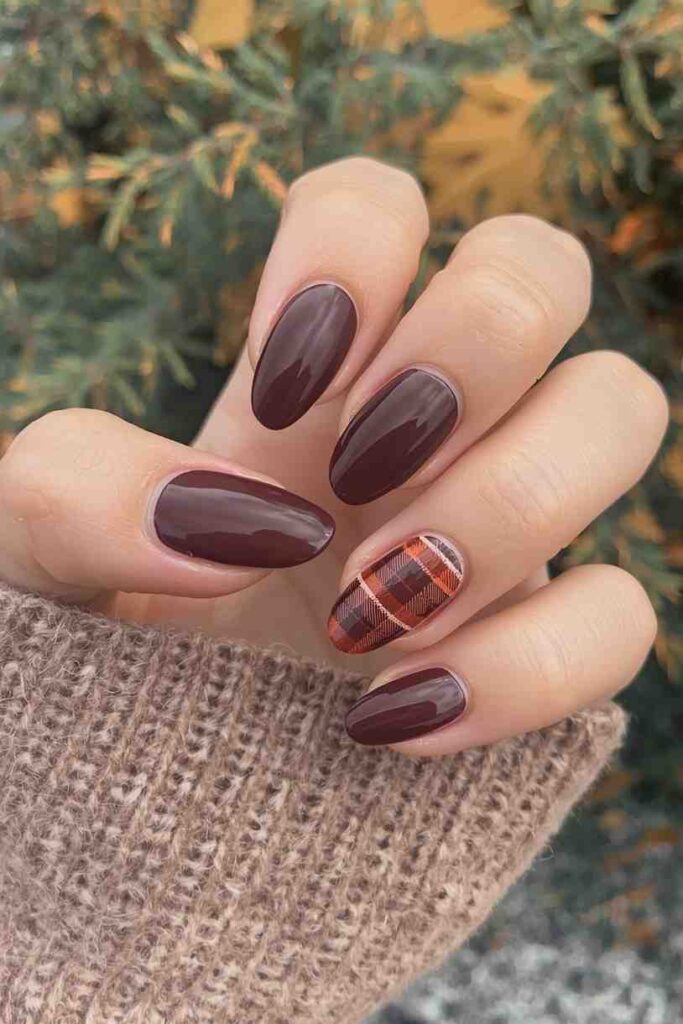 Plaid nails bring a playful yet stylish autumn touch. Using shades like brown, red, and beige, you can create classic patterns on accent nails. Plaid designs add personality while staying seasonally appropriate and chic.