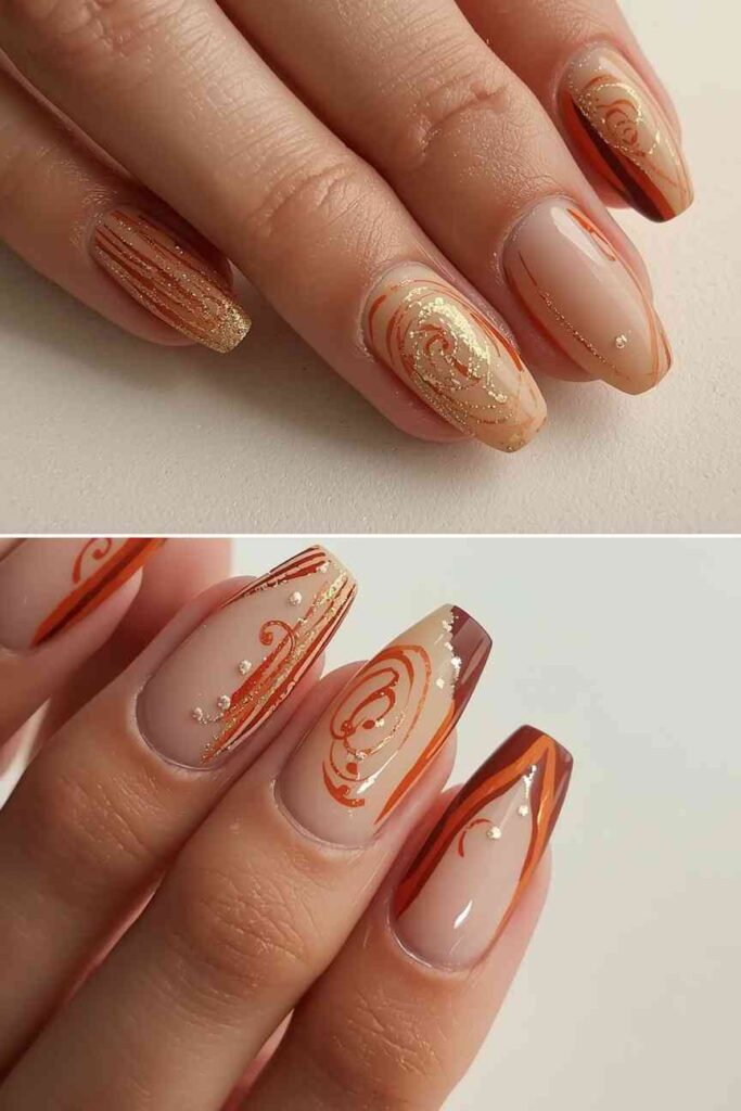 Pumpkin spice-inspired nails capture the essence of fall. Warm oranges, browns, and subtle gold shimmer create a seasonal and inviting look. This manicure is ideal for casual outings or festive occasions, giving your nails cozy autumn charm.