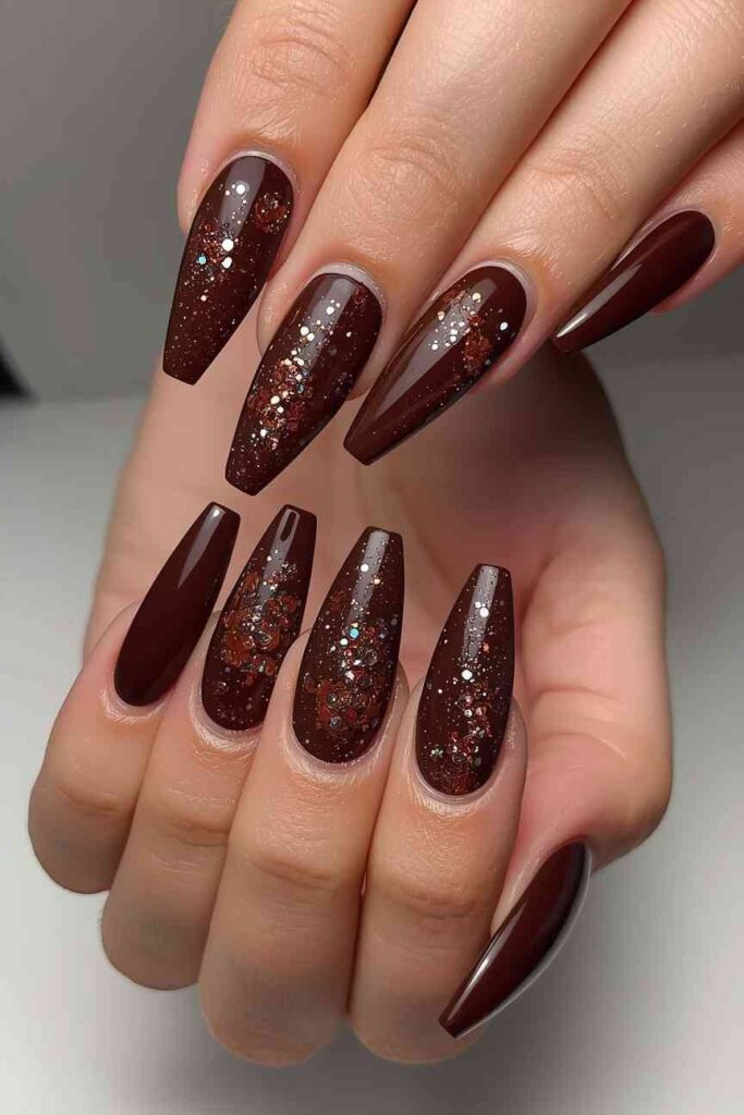 Adding glitter to dark chocolate nails creates sparkle and depth. This design balances elegance and fun, making it perfect for autumn evenings or festive gatherings. Glitter accent nails elevate the classic fall manicure.